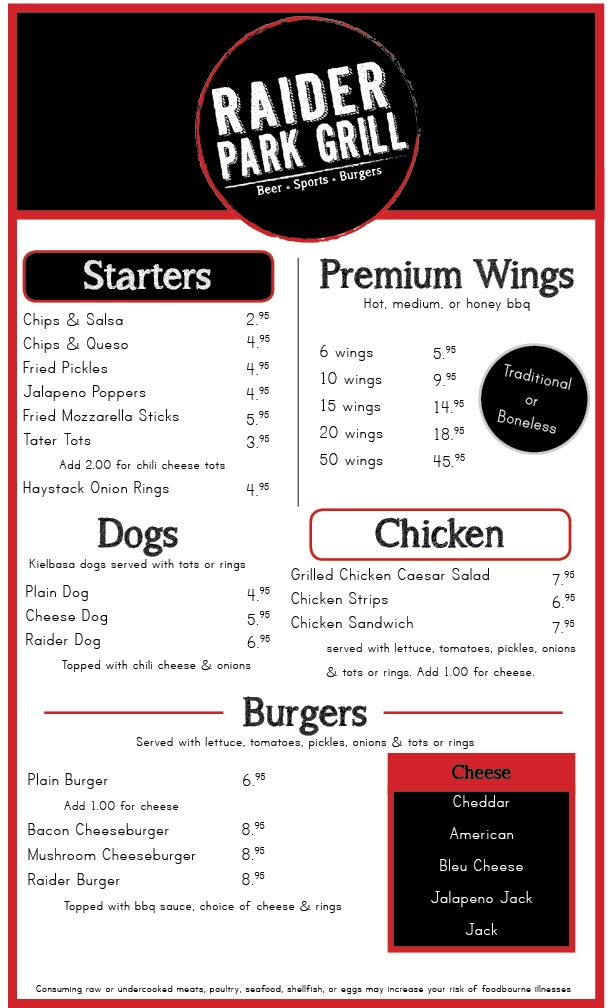 We tend to switch it up at Raider Park Grill, offering new burgers, appetizers, and specials on a whim. For updates on these delicious items, like us on Facebook! Our signature items are posted below: