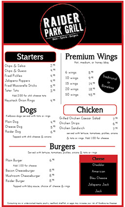We tend to switch it up at Raider Park Grill, offering new burgers, appetizers, and specials on a whim. For updates on these delicious items, like us on Facebook! Our signature items are posted below: